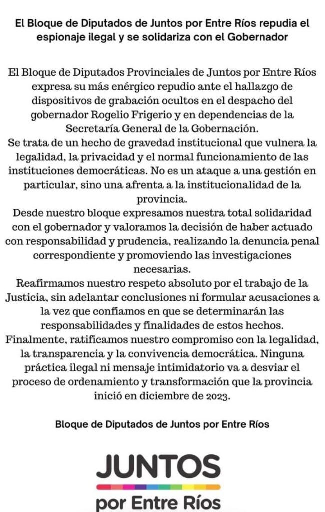El Foro de Intendentes de Juntos por Entre Ríos y el bloque de diputados provinciales de ese mismo espacio emitieron comunicados en las últimas horas, tras conocerse el hallazgo de dispositivos de audio y video ocultos en los despachos del gobernador Rogelio Frigerio y el secretario General de la Gobernación, Mauricio Colello.